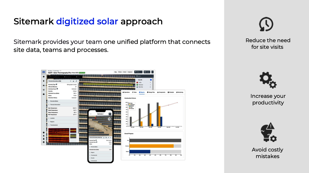 Sitemark helps solar professionals to increase productivity across the solar site lifecycle, by connecting data, teams, and processes into one, intuitive platform.