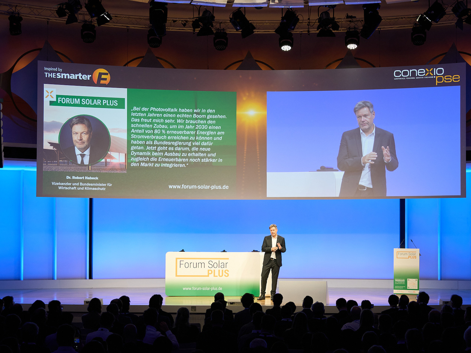Zu viel Solarstrom für zu wenig Netz – zu hohe Kosten: Auch der Vizekanzler und Wirtschaftsminister Robert Habeck (Bündnis 90/Die Grünen) griff das Thema in seiner diesjährigen Keynote auf dem Forum Solar PLUS auf: „Wir haben den Strom sauber gemacht, jetzt machen wir den Strom günstig“, lobte er die zu über 50 Prozent erneuerbar erzeugte Energie im deutschen Strommix. Die Erneuerbaren müssen nun den nächsten Lernschritt vollziehen, der in der Flexibilisierung besteht. Habeck sprach sich jedoch gegen eine zeitnahe, vollständige Kappung der EEG-Förderung aus: „Den Faden nicht abreißen“.