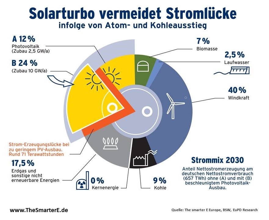 Anhand der Analyse verschiedener Szenarien kommt das Gutachten der Bonner Marktforscher „Energiewende im Kontext von Atom- und Kohleausstieg – Perspektiven im Strommarkt bis 2040“ zu dem Ergebnis, dass mit einer Verdreifachung der PV-Leistung bis 2030 die sich abzeichnende Stromlücke geschlossen werden könnte. Dies erfordert für das Jahr 2030 eine installierte PV-Leistung in Höhe von 162 Gigawatt (GW). Gegenwärtig sind rd. 1,7 Millionen Solarstromanlagen mit einer Spitzenleistung von rd. 48 GW in Deutschland installiert, die rund acht Prozent des Stromverbrauchs decken. Eine gute Marktverfügbarkeit, niedrigste Stromgestehungskosten im Kraftwerksbereich, sehr hohe Akzeptanzwerte in der Bevölkerung und eine vergleichsweise kurze Installationsdauer ermöglichen einen deutlich schnelleren Ausbau der Photovoltaik.