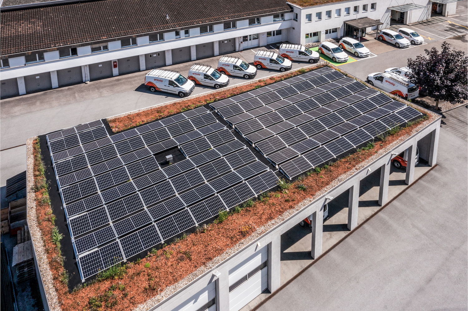 The pilot plant was commissioned in July 2021 and has been running smoothly since then. In the summer half-year, the PV system with its output of 36 kilowatt peak (kWp) and an area of around 180 square meters covers the entire electricity and heating requirements of the office and commercial building at GRAVAG's headquarters in St. Margrethen. In the process, surplus electricity is fed into ecocoach's ecoBatterySystem with a capacity of 65 kilowatt hours (kWh). When the battery storage is also fully charged, the excess PV electricity is converted into heat and stored. This heat is then available as hot water or for room heating. If the heat storage is also full, the surplus PV electricity flows into the public power grid.