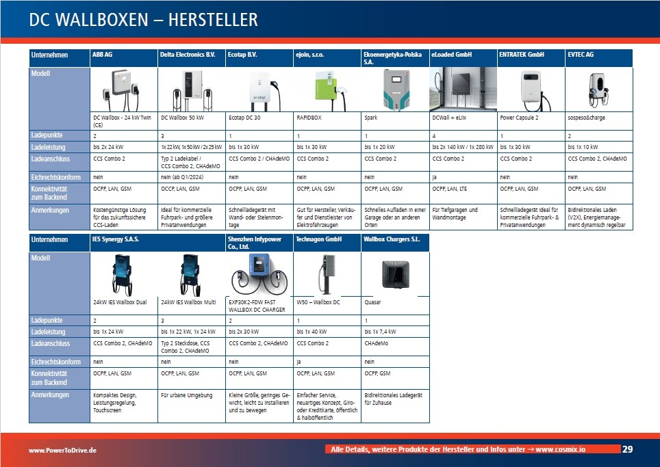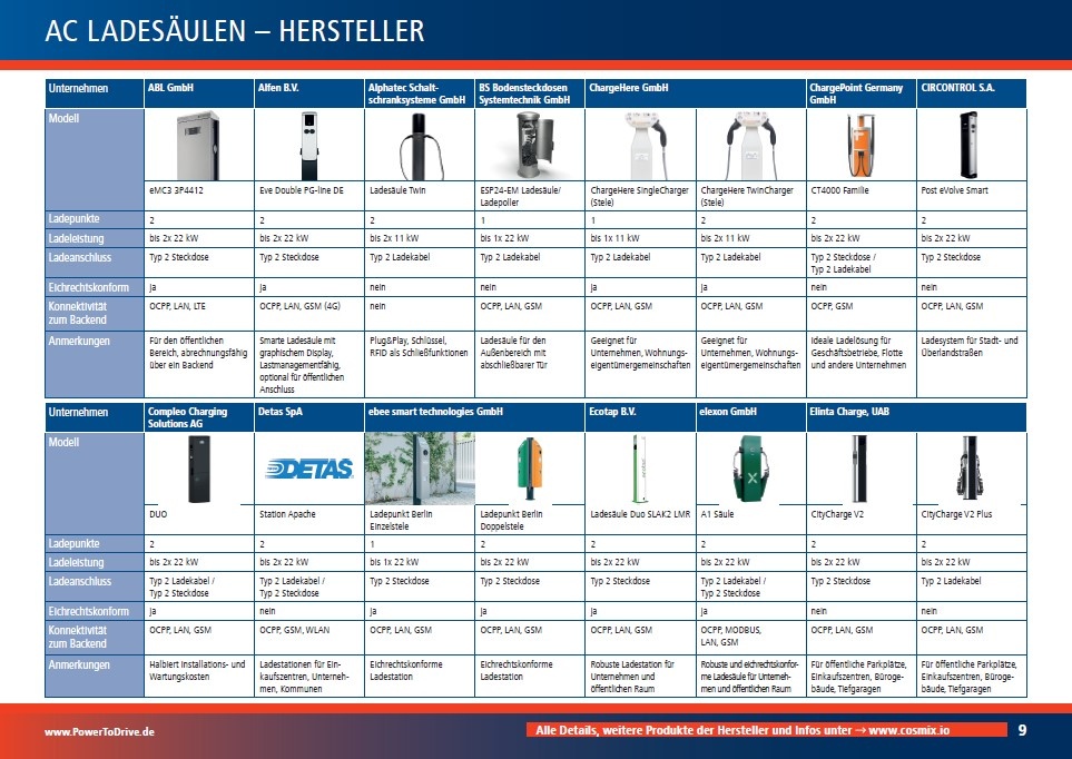 Die Power2Drive Europe "Marktübersicht Ladeinfrastruktur" in Kooperation mit unserem Partner cosmix bietet allen Interessierten – vom Spezialisten bis zum Newcomer – im Bereich Ladeinfrastruktur einen herstellerunabhängigen Überblick über die aktuellen Ladesysteme am Markt. Getreu unserem Motto „Charging the Future of Mobility“ bietet Ihnen die Marktübersicht eine einfache und schnelle Übersicht der wichtigsten Parameter intelligenter Ladesysteme.