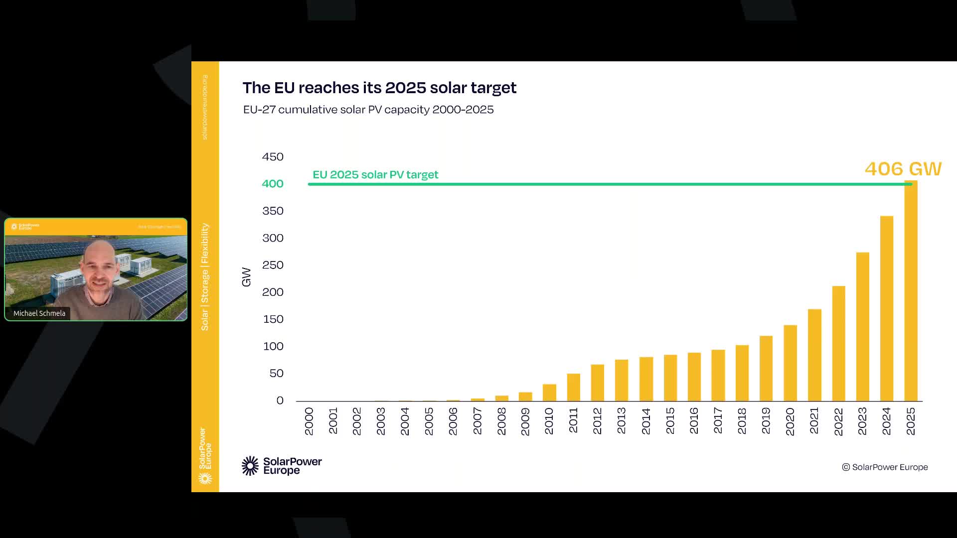 After years of record growth, the European solar market experienced a slight decline of 0.7 percent in 2025. 65.1 gigawatts were installed in the EU, with new installations characterized by an increasing shift toward the large-scale plant segment. One solar market performed with a particularly high growth rate: Romania grew by 2.5 gigawatts (GW) in 2025—an increase of 45 percent compared to 2024! The Balkan state stood out thanks to stable framework conditions and fast approval times for large-scale plants. In the webinar, you will learn everything about the most important developments in the EU solar market, and particularly the solar market in Romania.